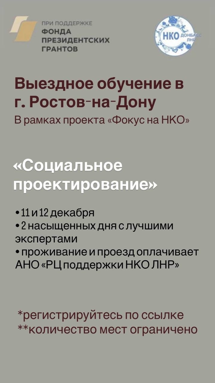 АНО «Ресурсный центр поддержки НКО ЛНР» в рамках проекта «Фокус на НКО», победителя конкурса Фонда президентского гранта, приглашает общественников и руководителей некоммерческих организаций Луганской Народной Республики принять участие в двухдневном выездном вебинаре, который пройдет в г. Ростове-на-Дону.