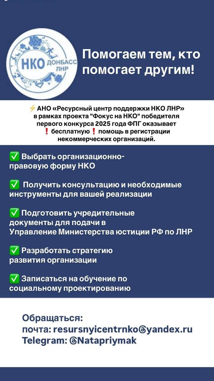 ⚡️АНО «Ресурсный центр поддержки НКО ЛНР» в рамках проекта "Фокус на НКО" победителя первого конкурса 2025 года ФПГ оказывает ❗️бесплатную❗️помощь в регистрации некоммерческих организаций.